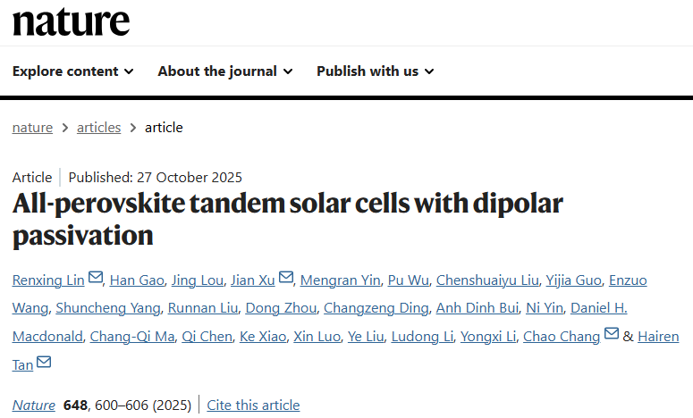 当全球都在为碳中和焦头烂额,当电费账单依旧牵动千家万户,一项来自中国的科研突破,正在彻底改写人类利用太阳能的游戏规则——南京大学谭海仁教授团队领衔的研究,将全钙钛矿叠层太阳能电池效率推至30.6%,经国际权威认证的稳定效率达30.1%,这项登顶《Nature》的成果,不仅刷新世界纪录,更让“清洁能源自由”从遥远梦想照进现实!