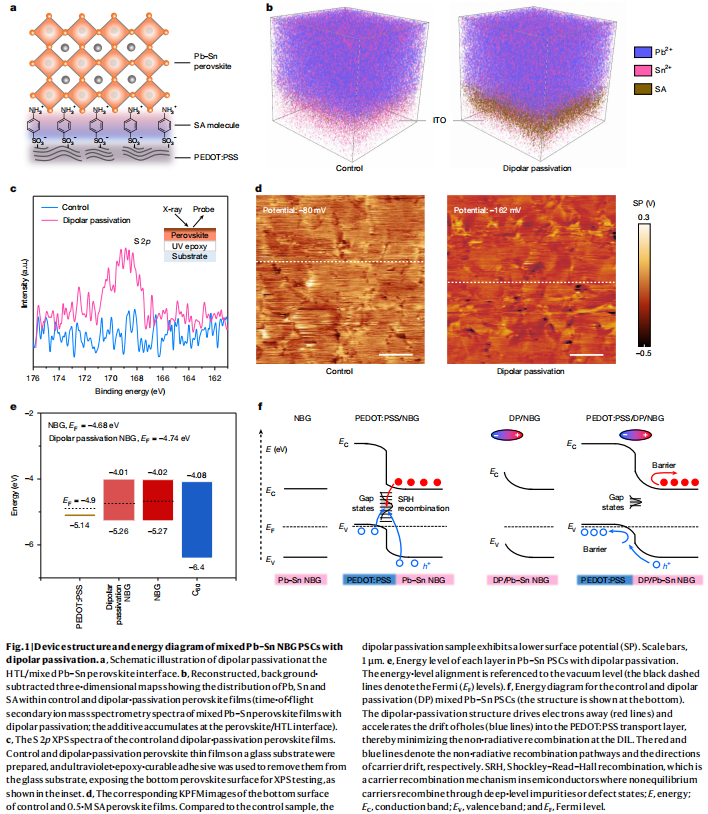 关键的点睛之笔,是这些分子形成的“内置电场指挥系统”:氨基朝向钙钛矿、磺酸基朝向传输层的定向排列,构建出从钙钛矿指向传输层的分子偶极矩。这相当于为载流子开辟了“单行道”——空穴被加速推入传输层,电子则被牢牢阻挡,彻底切断了复合损耗的路径。