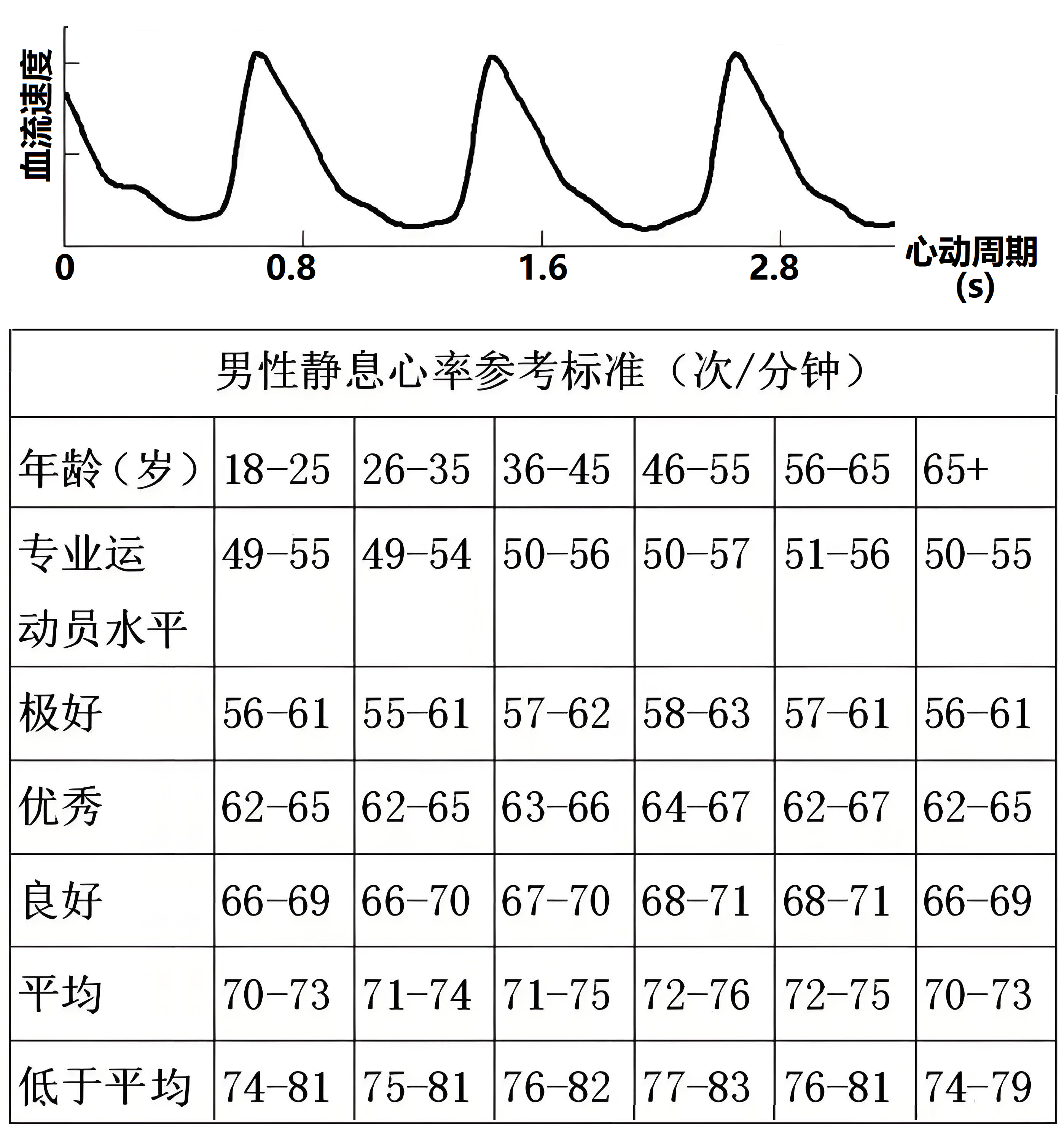 心率受年龄和性别的影响,胎儿110-160次/分,婴儿120-140次/分,幼儿90-100次/分,儿童80-90次/分。正常成人心率为60-100次/分,通常为70-80次/分,平均约72次/分。老年人心率较慢,为55-60次/分(图2)。