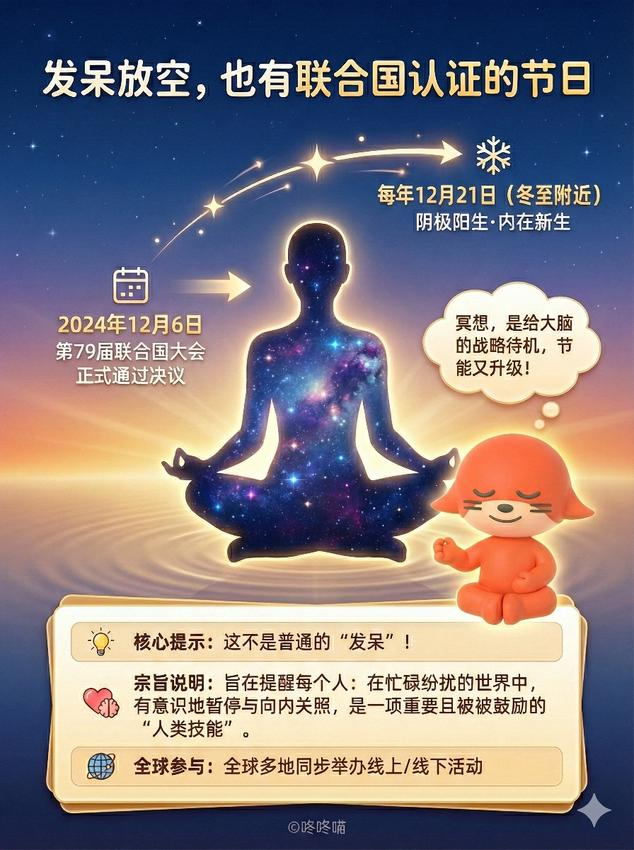 2024年12月6日,联合国大会通过决议,将每年12月21日(北半球冬至日附近)定为“世界冥想日”。这一天白昼最短、黑夜最长,仿佛呼应着“静极而生光”的古老智慧。
