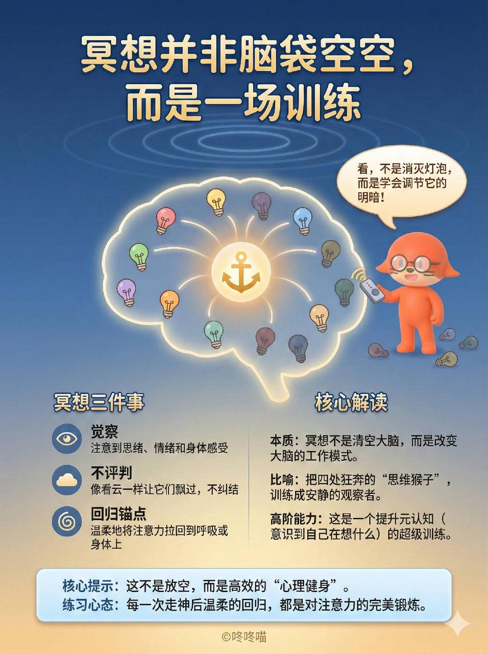 这本质上是在锻炼我们注意力的“肌肉”,帮助我们在纷扰中保持内在的稳定与清晰。咚咚喵看来,这种训练比想象中更接近我们日常的“健身”。