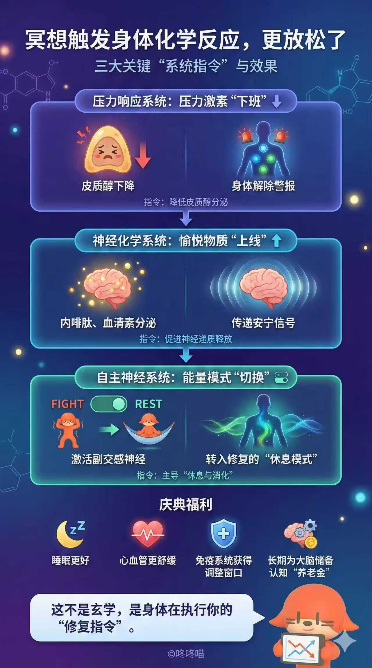 咚咚喵发现,当人们闭眼静坐,身体内部其实正启动一系列精微的生化调整。最显著的变化包括压力激素(如皮质醇)水平的下降,以及提升情绪的神经递质(如内啡肽、血清素)分泌的增加。