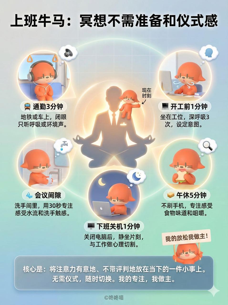 这个咚咚喵能理解,但事实上,冥想无需特定的仪式或环境,其精髓在于当下的觉察。