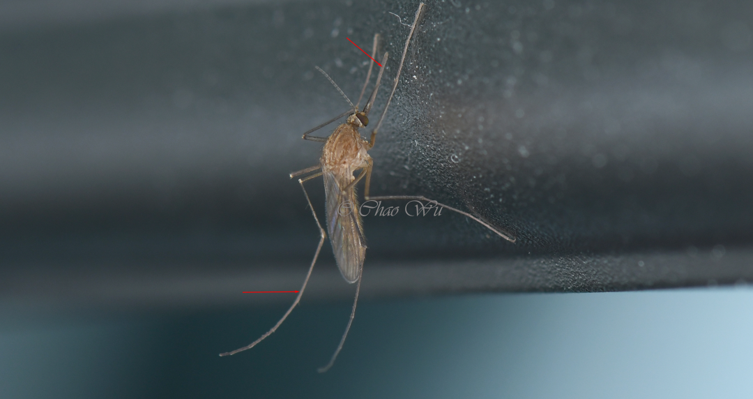 1.看前后足:在这些“蚊子”的六条腿中,摇蚊通常前足较长,而蚊科的“蚊子”后足较长。在停落时,摇蚊多用中后足支撑身体,而吸血的蚊往往用前中足支撑身体,而翘着后足。
