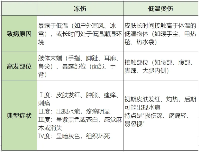 冻伤和低温烫伤看似一“冷”一“热”截然相反,实则都与“低温”有关。它们在成因、部位和症状上有明显区别: