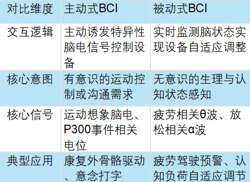 脑机接口主要存在两种核心工作逻辑:主动向机器发送指令与被动适配人体状态,二者功能互补,可覆盖不同应用场景需求: