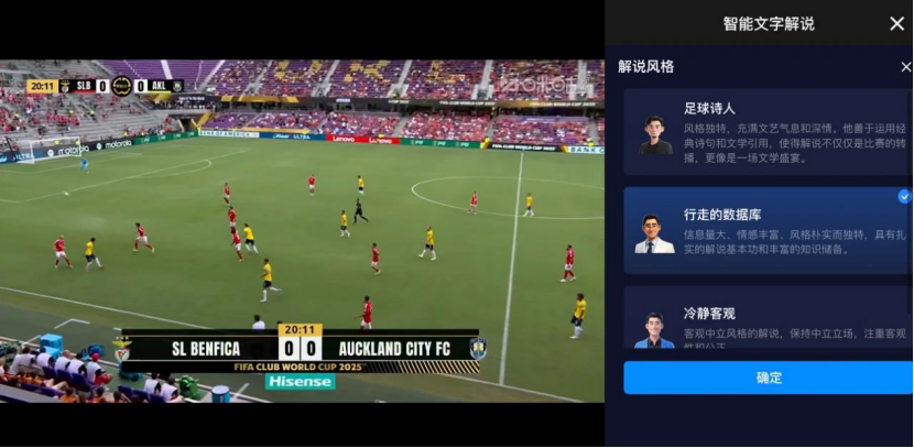 2025年世俱杯期间,AI智能解说全新升级,通过文体大模型自动生成多种风格文本供球迷选择:以诗化语言点燃赛场激情的“足球诗人”、用精准数据拆解战术博弈的“行走的数据库”,还有专注技术细节分析的“冷静客观”,三种风格可自由切换,不仅实时解读场上数据,更融入球队历史、球星故事等丰富周边信息,每场比赛都能拥有独一无二的听觉体验。