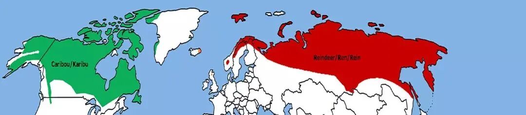 北美地区把驯鹿叫做caribou(绿色),而欧洲地区喜欢叫做reindeer(红色),橙色的小点表示曾引入驯鹿的地区丨TBjornstad / wikipedia