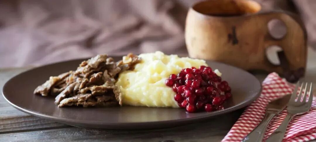 芬兰美食炒驯鹿肉,这道菜通常会搭配土豆泥食用,在芬兰各地一年四季都能品尝到丨visitfinland