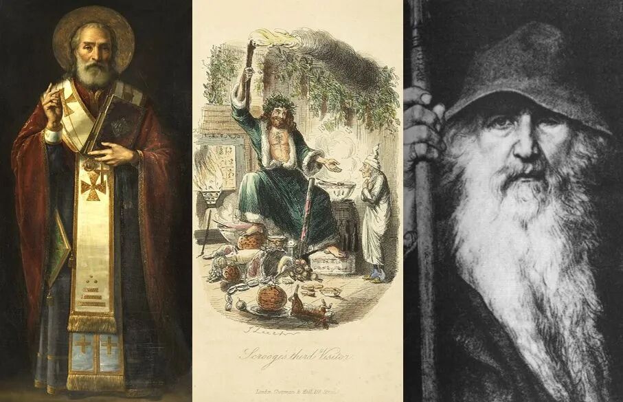想像一下,给穷苦人送礼物的圣尼古拉斯(左)、外表可变化的圣诞之父(中)和挪威神奥丁(右)一起对你说:“Ho Ho Ho! Merry Christmas!”丨Jaroslav Čermák & John Leech & Georg von Rosen / wikipedia