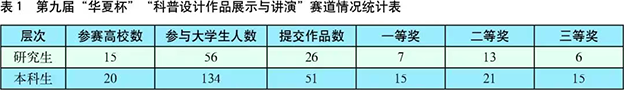 内容创新是本届“华夏杯”最大亮点。在“科普设计作品展示与讲演”赛道,组委会收到参赛选手提交的科普设计作品77项。其中,15所高校的56名研究生提交了26项作品,占参与高校的17.9%;20所高校的134名本科生提交了51项作品,占参与高校的23.8%。在87项作品中,仅有1件作品的受众是普通公众,大多数面向中学生,部分面向大学低年级学生。具体获奖详细情况见表1。