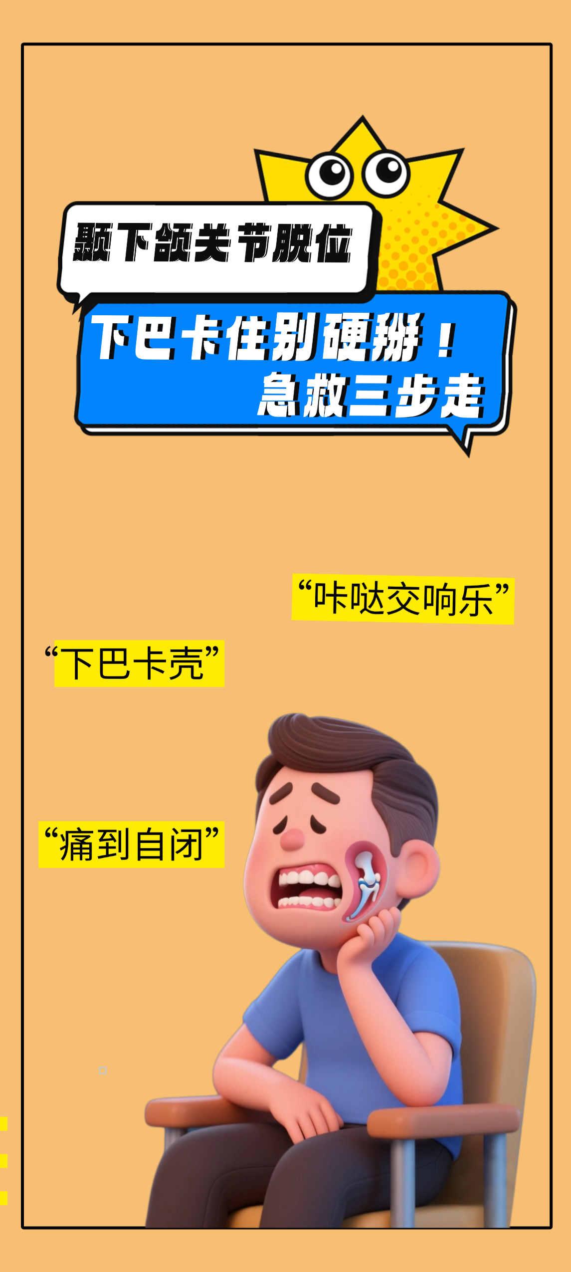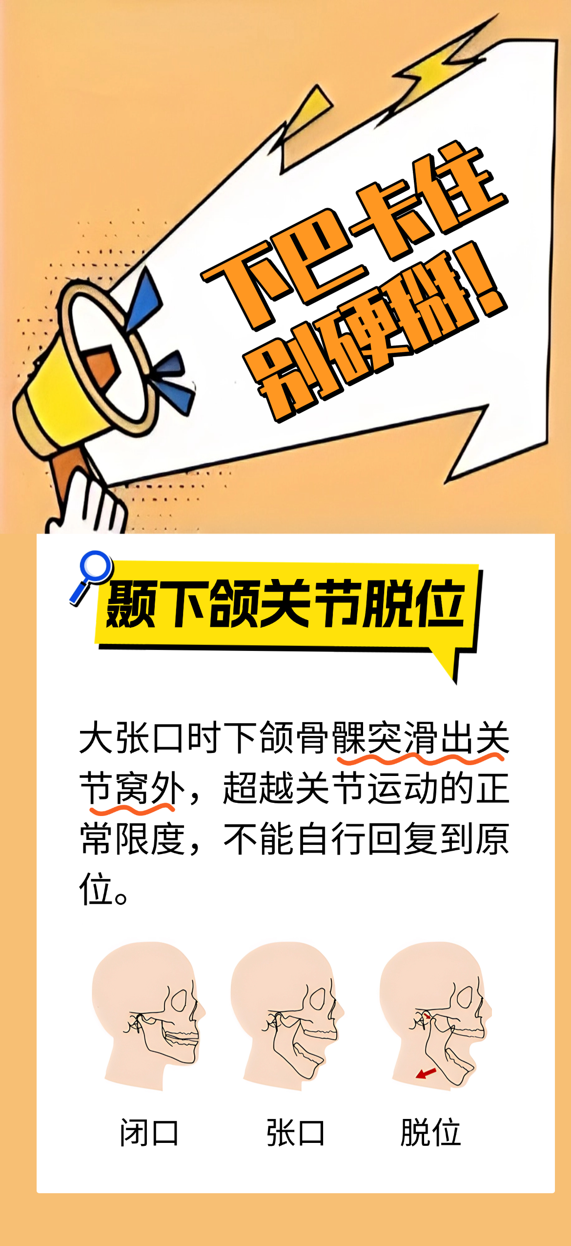 打哈欠、吃东西或说话时,突然听到“咔哒”一声,下巴便动弹不得,伴随一阵刺痛,甚至直冒冷汗——这很可能就是颞下颌关节脱位,俗称“掉下巴”。这种情况往往发生得猝不及防,但若处置不当,不仅会加重疼痛,还容易反复发作,严重影响咀嚼、说话等日常功能。