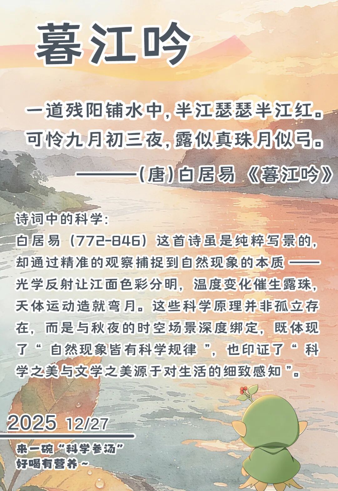 愿你如残阳铺江般舒展,每份真诚都换得暖意,所求皆如愿;纵使遇风雨,也学江面半绿半红的韧性,把坎坷熬成成长的光泽。秋夜有露亦有月,累了就歇脚添衣,别苛责自己,愿你携诗中暖意前行,平安且有力量。