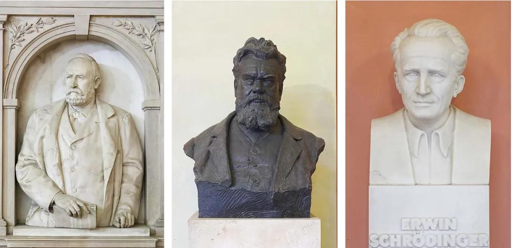 左图:今日奥地利维也纳大学拱廊庭院内的约瑟夫·斯特藩纪念碑,于1896年揭幕。中、右图:同一个庭院内还有玻尔兹曼和薛定谔的纪念碑。| 图源:wikipedia