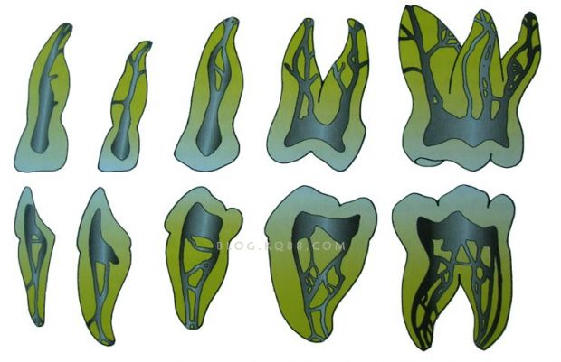 简单地说,根管指的是牙根里面的神经血管(图中黑色的树枝一样的部分)。根管治疗就是把感染的神经血管去除,清洁牙根内部,再用无菌的药物将牙根内填满。
