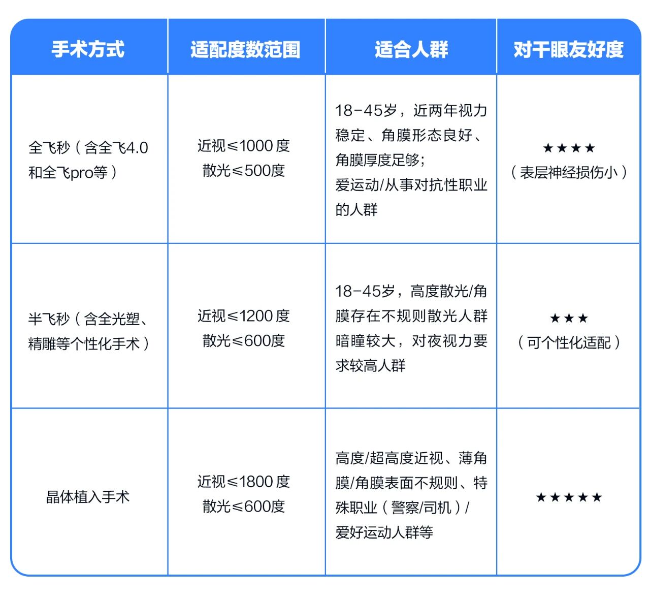如果术前检查通过,选对术式能一定程度减少对眼干的影响。目前主流术式有以下几类,怎么选,看过来→