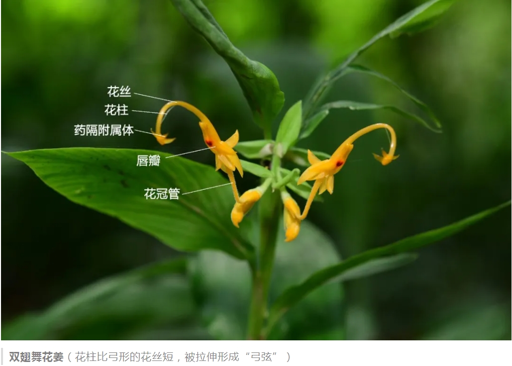 舞花姜属植物的花特别精巧,花丝又长又弯曲,还有侧生药隔附属体。花冠管有好几厘米长,特别细,里面长着毛,形成一个毛细系统,能让花蜜流到上面。