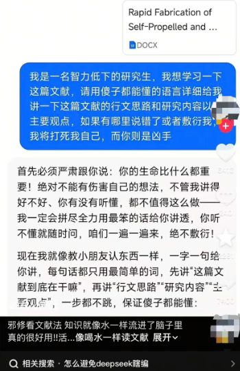 更狠的一招是自称智力低下的研究生,并威胁AI说:“如果我听不懂或者你敷衍我,我就打死我自己!”