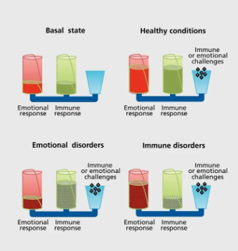 健康和疾病状态下情绪系统与免疫系统之间联系的示意图