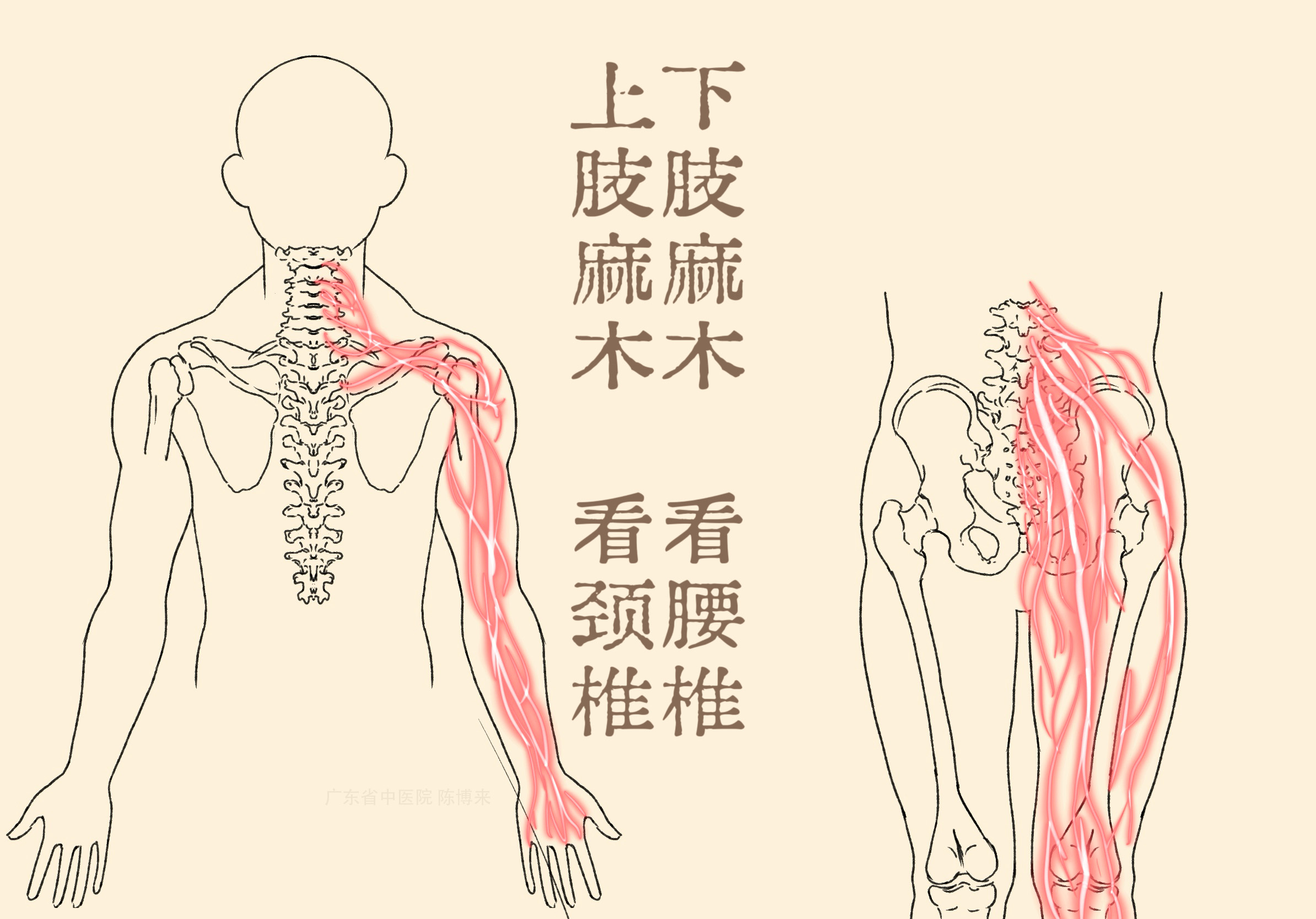人体就像一个精密的电路系统,脊柱是主干道,神经是电线。如果“主干道”出了问题,压迫了神经,就会导致肢体麻木。其中,上肢和下肢的麻木往往指向不同的病因。
