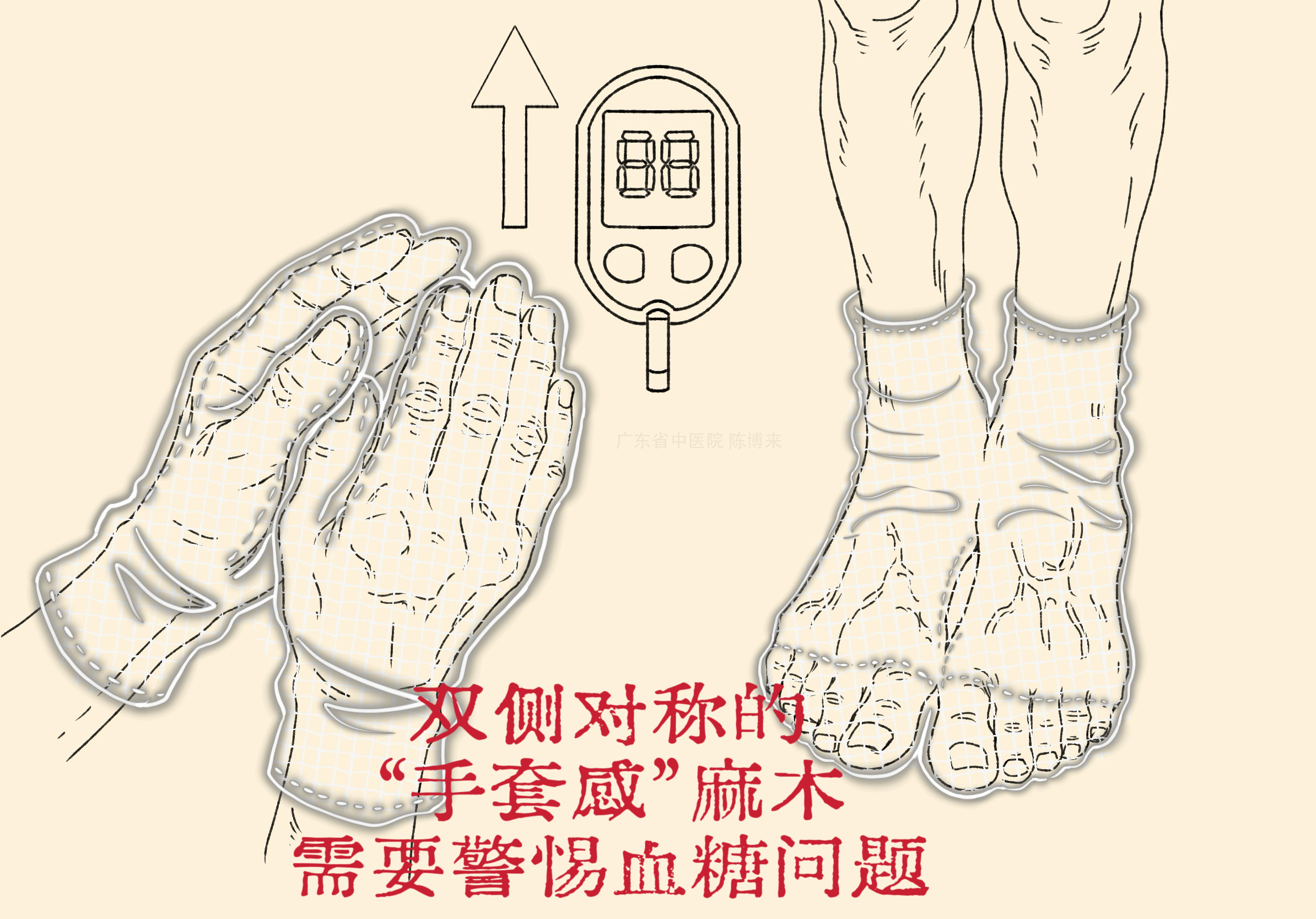 不同于脊椎病引起的单侧麻木,代谢性疾病导致的麻木通常表现为四肢末端对称性的感觉减退。最典型的就是糖尿病周围神经病变,患者常感觉双手双脚像戴了手套或穿了厚袜子一样,对冷热疼痛的感觉变迟钝。