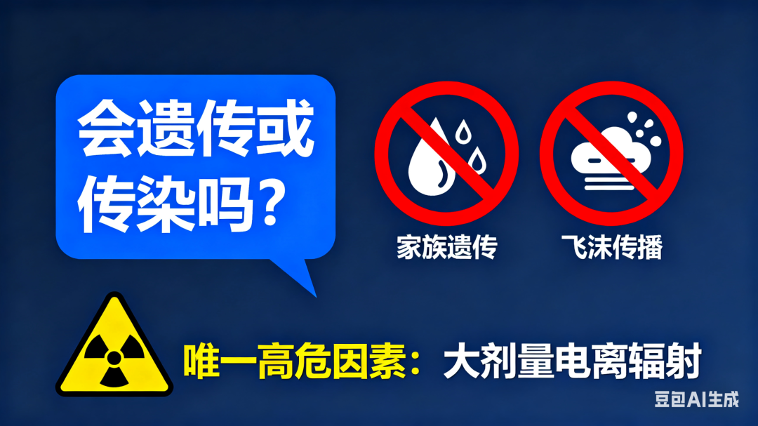 答案是:都不会。导致慢粒的基因突变是后天获得的,并非由父母遗传,也完全不具有传染性。目前唯一明确的高危因素是大剂量电离辐射。该病可发生于任何年龄,但中老年发病率相对较高。