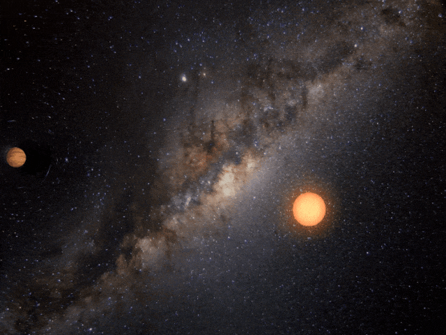 当一颗流浪行星从背景恒星前方掠过时,其引力会如透镜般弯曲星光,使恒星短暂增亮。(动画制作:吴泽炫;素材来源:喻京川,Serge Brunier)