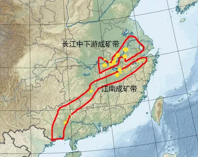在中国的过去和今天,例如湖北大冶、安徽铜陵、江西德兴,这些最重要的铜矿,大致分布在下图的这个区域里。