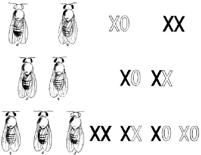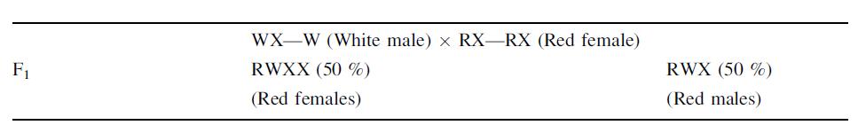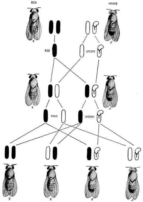 [3] 那时仍不知道果蝇雄性个体有Y染色体;在很多种类的昆虫中,雄性是XO,而雌性是XX,所以认为果蝇也是这样(参见图1,摩尔根在1913年的早期性别限定的标识方式)。到了1915年,已经清楚雄性果蝇确实有Y染色体,应该标识为XY。