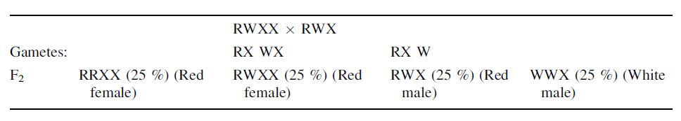 这里红眼雌果蝇有两种类型:一种是纯合体(RR),另一种是杂合体(RW);但是对于雄果蝇有两种基因型和两种表型:红眼雄果蝇是杂合体(RW),白眼雄果蝇是纯合体(WW)。现在摩尔根左右为难,他完全知道“为了获得这样的结果,必须假设……当F1代雄性红眼果蝇(RWX)形成两类精子的时候,R和X在一起,否者结果就不符合(如图所示)”。在最后,摩尔根假设R和X总偶联在一起,把眼色因子和X染色体看作是独立的实体。也许他已经考虑用其他方法描述杂交结果,但此时他还沿用以上符号,并把眼色和性别看作独立的因子。