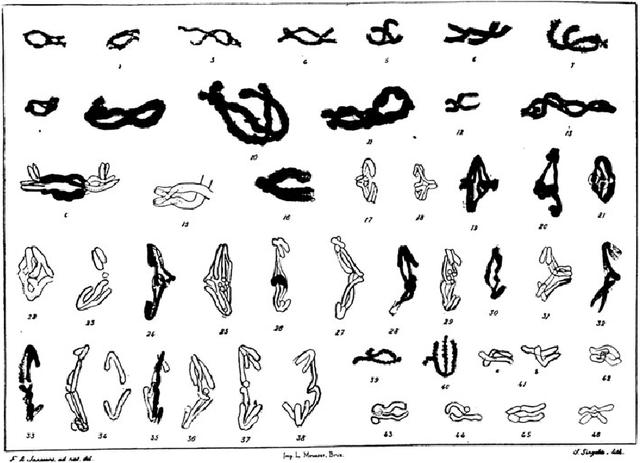 图3 1909年比利时细胞学家詹尼斯在论文中描述的,不同阶段的染色体交叉(准确的说应该是同源染色体对复制后,四分体状态的姐妹染色单体)。詹尼斯认为在姐妹染色单体交叉的地方,可能发生同源染色体之间的断裂和重连,产生包含着父母双方的互补片段的姐妹染色单体。(仿自詹尼斯,摩尔根发表于1913: p. 93)
