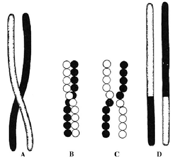 图4 表示同源染色体(更确切的说是姐妹染色单体)联会的示意图,摩尔根1915, a和 d姐妹染色单体交换了同源部分; b 和 c表示了由单个基因组成的染色体。黑白两色分别代表同源染色体来自亲本中的父方母方 (Morgan et al. 1915: p. 60) 。