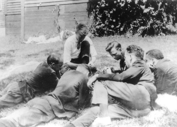 果蝇研究还是现代生物学中实验室团队研究的代表。从社会学角度来看,这是一段很有意思的历史。在1911-1915年间,团队像一个整体,工作气氛和关系是很开放和自由的,日后的内部争斗还未露端倪。大家很享受夏天在MBL开的实验室聚会和非正式“实验室会议” (图5)。实际上,他们第一次推动了新的科学研究形态—团队研究。在19世纪和20世纪早期,生物中的科学研究工作主要由个人进行研究。论文和专著都由一个研究者撰写,多个共同作者的情况比较少见。绝大多数欧洲实验室受正统规则主导,等级分明。摩尔根的研究组则打破了常规,以更加自由流动的方式运作,老师参与少,由学生做主。