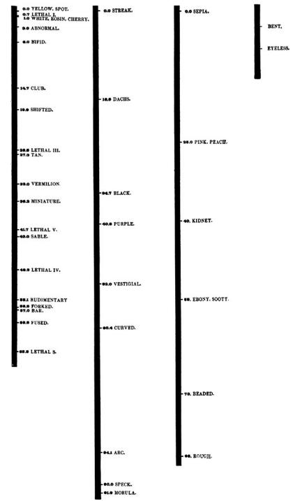 在这一时期,摩尔根意识到他一个人跟不上快速增长的果蝇研究工作了,于是开始培养有天赋的本科生。在他实验室日后毕业的学生中,有三人最为著名:阿尔弗雷德·斯特蒂文特、卡尔文·布里奇和赫尔曼·穆勒。摩尔根越来越依赖这些学生从事日常工作,去揭示业已结合在一起的孟德尔-染色体范式之间的内在联系。举个例子,1911年,摩尔根与斯特蒂文特讨论重组频率与染色体上两个基因间距离的问题时,遗传图谱的想法诞生了。斯特蒂文特回忆,当晚他回家后,彻底被这个想法迷住了,忘记了写家庭作业,并绘制了第一幅染色体图谱:染色体上连锁的6个基因(Sturtevant 1965: 47)。之后染色体图谱绘制工作迅速展开,最终在果蝇四对染色体上定位了数百个基因。