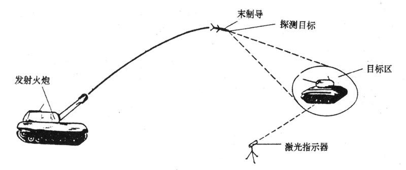 当炮弹飞到弹道顶点时,控制舵内的惯性陀螺开始发出控制信号,操纵舵面调整弹丸的飞行姿态。当弹丸飞到距离目标大约3 000米时,观察员用激光器发射编码激光照射目标。弹上的导引头搜索并接收到目标反射的激光信号以后,立刻对目标进行跟踪和锁定,弹丸沿着激光束快速飞向目标,引爆战斗部将其摧毁。