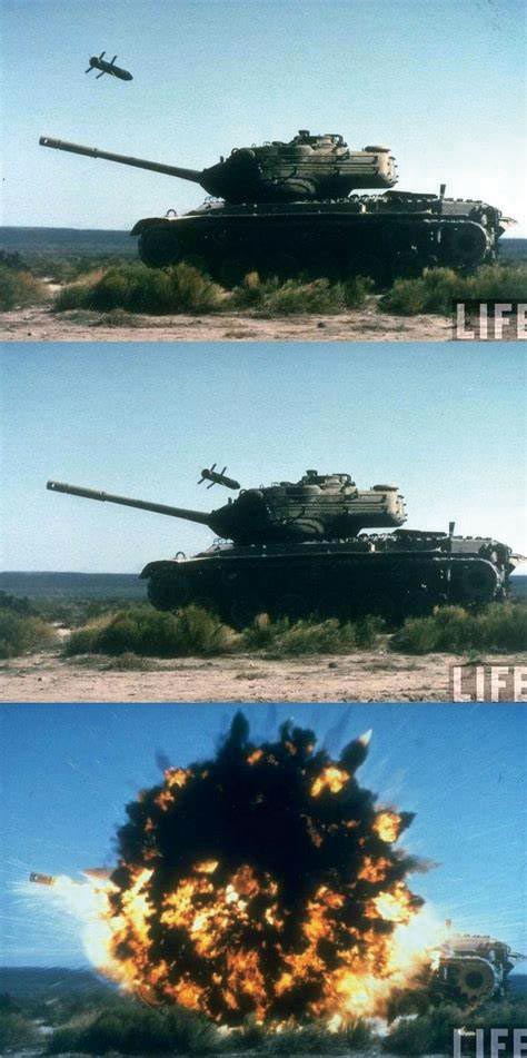 ▲ 即将击中坦克靶标的M712“铜斑蛇”末制导炮弹