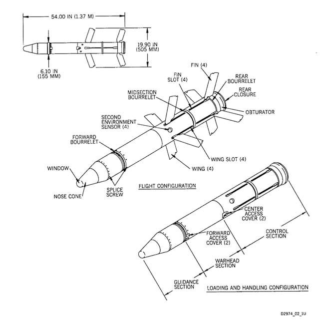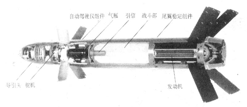 ▲ 美国“铜斑蛇”末制导炮弹内部结构图