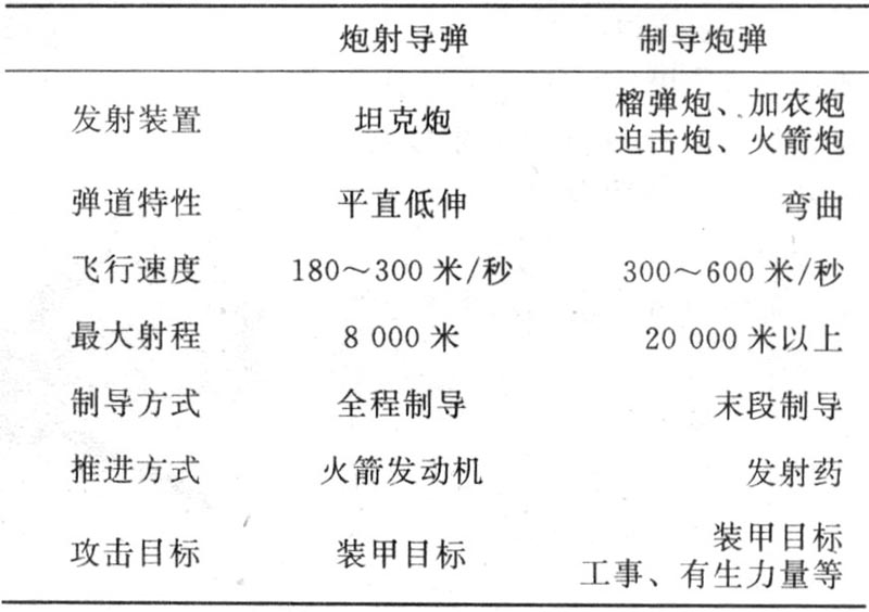 从广义上说,凡是用火炮作为发射装置发射的导弹,都可以叫炮射导弹。但在实际中,我们所说的炮射导弹,一般都专指用坦克炮发射的反坦克导弹。制导炮弹所涉及的范围要广得多,凡是用榴弹炮、加农炮、迫击炮、火箭炮等各种火炮发射的装有某种制导装置的炮弹,都可叫制导炮弹。从下表中,我们可以更清楚地区分、比较两者。
