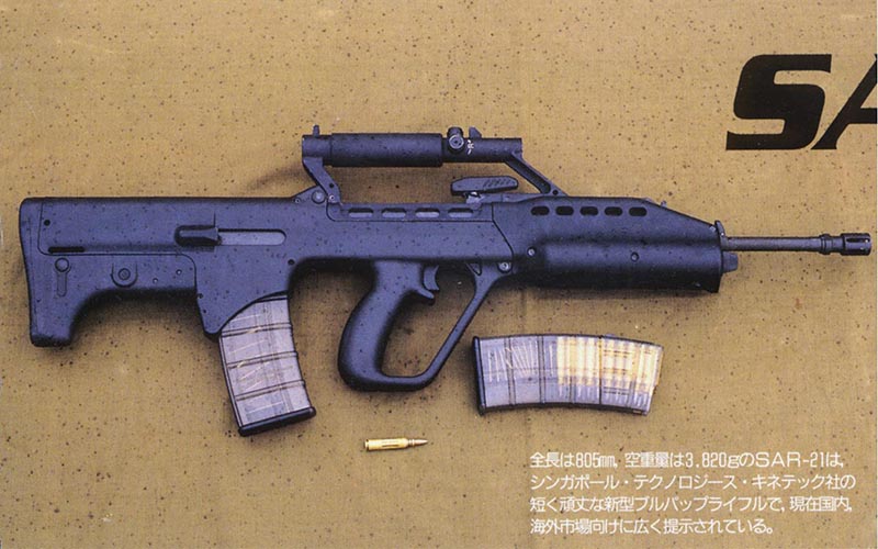 新加坡5.56毫米SAR21突击步枪该枪是新加坡为21世纪准备的,采用导气式工作方式,无托设计,长805毫米,空枪重3.82千克,用来替换新加坡武装部队中的5.56毫米M16A1、SAR80和SR88A突击步枪。