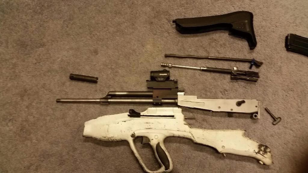 位于扳机前方的射击选择钮(单发、自动)与保险开关是分开的,待击杆位于上机匣左侧,枪托里面装有清洁工具。