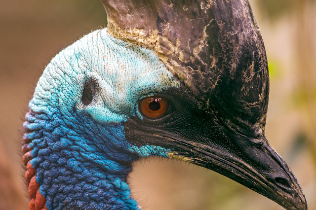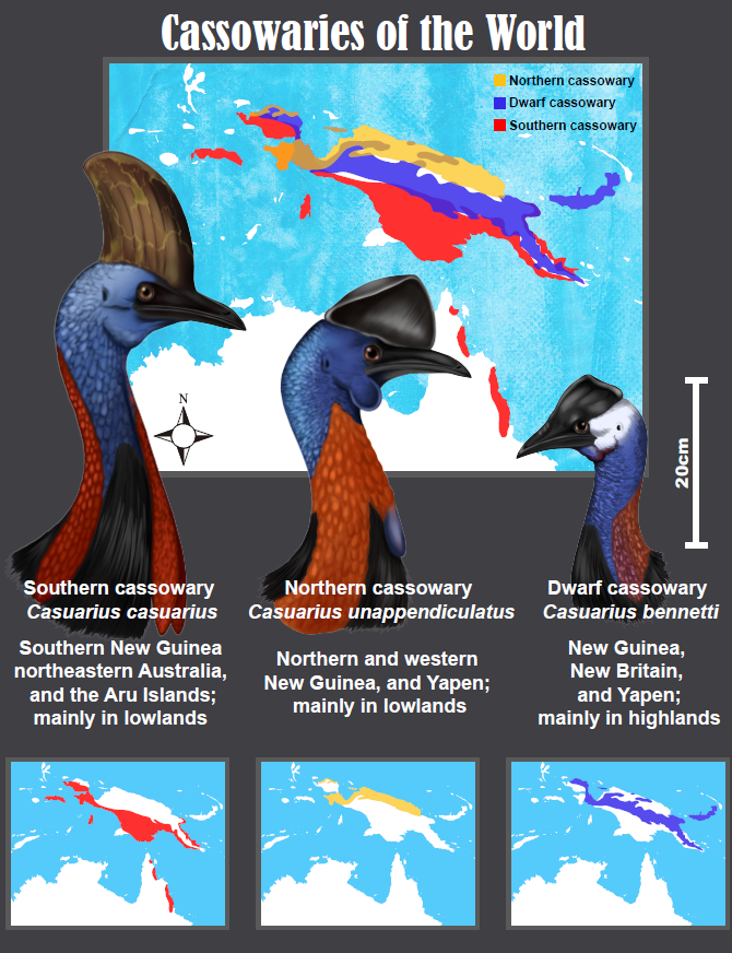 当巴克兰(William Buckland)在1824年发表了第一种以科学方式描述和命名的恐龙时,他一定想不到一个多世纪后,人们才恍然发现自己津津乐道了这么久的远古巨兽,原来一直是我们头顶上盘旋的邻居、林间地头的歌手,以及餐桌上的美味。 在我个人眼里,现存鸟类中最能向我们展现双足恐龙风采有两种:一种是几乎完美复刻了小型盗龙气质的走鹃,另一种则是基本相当于少了条尾巴的中型双足恐龙——双垂鹤鸵。 可能是最古怪的鸟 双垂鹤鸵(Casuarius casuarius)是现存的三种鹤鸵之一,另外两种分别是单垂鹤鸵(C. unappendiculatus)和侏鹤鸵(C. bennetti)。 “单垂”和“双垂”分别指的是那两种鹤鸵颈部肉垂的数量;它们的英文俗名则分别是北方鹤鸵(Northern cassowary)和南方鹤鸵(Southern cassowary),因为前者分布在新几内亚岛的北部、西部以及亚彭岛,后者则分布在新几内亚岛南部以及澳大利亚东北角和阿鲁群岛。侏鹤鸵体型最小,分布海拔相对更高。 三种鹤鸵以及其分布,从左到右分别是双垂鹤鸵、单垂鹤鸵和侏鹤鸵。绘图:虫爷ChenZ 鹤鸵所在的古颚类包含了很多大家耳熟能详的不会飞的家伙,比如鸵鸟、鸸鹋、几维鸟,比起那些天生灵巧轻盈飞鸟亲戚,真可以说是“一个天上一个地下”了。 古颚类的外表还十分憨憨:长得像个插着筷子的猕猴桃的几维鸟就不提了,鸵鸟这种很能打的运动健将也会被强行安上遇到危险就把脑袋埋进沙子里的设定。相比之下,一脸凶神恶煞的鹤鸵就像人畜无害的清流中的一股泥石流,撑起了兄弟姐妹们的排面。 双垂鹤鸵可以长到1.5到1.8米高,雌性的平均体重将近60公斤,数据和一个成年人相仿(雄性体型小于雌性)。它是现存第二重的鸟类。 红色和蓝色搭配的裸露头颈部皮肤和肉垂,一身黑得发亮的粗长羽毛,以及一张凶帅凶帅的脸,让双垂鹤鸵看起来比世界上最大的鸟——非洲鸵鸟——要有压迫感得多。在长满了桫椤和棕榈、时间仿佛停滞了几千万年的澳洲东北角雨林里猛然遭遇一只双垂鹤鸵,可能是现实生活中最接近《侏罗纪公园》的场面了。 鹤鸵身上另一个非常“恐龙”的地方就是它的前肢是有爪子的,而且很长。不过由于那一身厚实又蓬松的长毛以及和暴龙一样是个小短手,鹤鸵平时看起来好像只有两条腿似的。 看起来笨重的头冠有什么用 鹤鸵脑袋上那个奇特又显眼的头冠同样引人注目。和犀鸟与巨嘴鸟巨大的喙一样,鹤鸵的头冠也是中空的,远比看起来要轻。 当一种生物长了个看起来花哨无用的器官,稍了解一点生物学知识的人大概会首先想到“万恶的”性选择,所以一些观点自然而然地认为鹤鸵的头冠也是在求偶中夸耀自己的工具。然而在实际中,鹤鸵并不是一种两性差异明显的动物,雌性鹤鸵一样有发达的头冠。 另一种解释是,当鹤鸵在密林中穿梭时,头冠可以帮助拨开面前浓密的植物。此外,头冠还被推测为同类争斗时的工具、鸣叫时的扩音器(就像副栉龙等恐龙中空的头冠一样),以及用于散热降温。 在已经灭绝的恐龙中,窃蛋龙类可能是和鹤鸵相似度最高的类群了。它们往往同样有着长长的脖子,没有牙齿的角质喙,以及标志性的头冠。因此在窃蛋龙类的复原图里,“鹤鸵元素”的运用很常见,比如参照鹤鸵复原的头冠、头颈部蓝色和红色的裸露皮肤。 它们为什么频频伤人 鹤鸵这幅凌厉又富有压迫感的外表可不只是拿来看看的,它还有着鸟类中可能是最强的对人战斗力。鹤鸵内侧的脚趾(从两脚之间往外数的第一个)装备着一枚尖刀般又粗又长的爪子,搭配承载几十公斤的身躯在雨林里来去自如的脚力,让它们获得了“杀人鸟”的名号。 鹤鸵是极少数有着明确杀人记录的鸟类,而它们也完全具备杀人的实力。不过,研究者们在统计袭击事件后发现,75%的攻击都和人类的投喂行为有关:被人类投喂过的鹤鸵,会因为饥饿而靠近人类,从而大大增加了冲突发生的可能性。其他大多数攻击行为都是为了保护自己,或者守护自己的领地、蛋和雏鸟。 此外,鹤鸵也会攻击人类带来的入侵物种——猫、狗,以及牛等家畜,原因也大同小异。总的来说,与其说鹤鸵生性凶恶,不如说它们是奋起保护自己的“硬茬”。 现代第一起被详细记录的鹤鸵杀人事件发生在1926年,起因是澳洲的两兄弟企图用棍棒杀死一只鹤鸵,结果弟弟被打跑,哥哥则被一脚割开了脖子。另有一起事件2019年刚刚发生在佛罗里达,一名饲主被他当作宠物饲养的鹤鸵踢死。 和大部分野生动物袭击人类的事件一样,鹤鸵对主动招惹人类并没有兴趣。悲剧的发生,往往是因为人类没有给予野生动物足够的距离和尊重。 虽然有着可以打爆两脚兽的实力,但鹤鸵只想过平静的生活。 “杀人鸟”的担忧是什么 鹤鸵最爱各种果实,比如多花海芒果,这是一种对人和其他动物有毒的巨大蓝色果实,它的英文俗名cassowary plum(鹤鸵李子),反映了它和鹤鸵的密切关系。此外,棕榈、月桂、野葡萄等果实也是鹤鸵的心头好。 当鹤鸵找到一棵果实成熟掉落的树时,往往会把这棵树暂时“据为己有”,盘踞守护好几天,赶走其他想要靠近分一杯羹的同类。对果实的热爱让鹤鸵成了雨林里的“快递员”,它们把种子传播到森林的各个角落,千百年来持续不断地栽种着澳洲和新几内亚岛原始风貌的雨林。除了各种果实和其他植物性食物,鹤鸵也会吃点昆虫或者其他小动物开开荤。 不但外表特立独行,鹤鸵的家庭