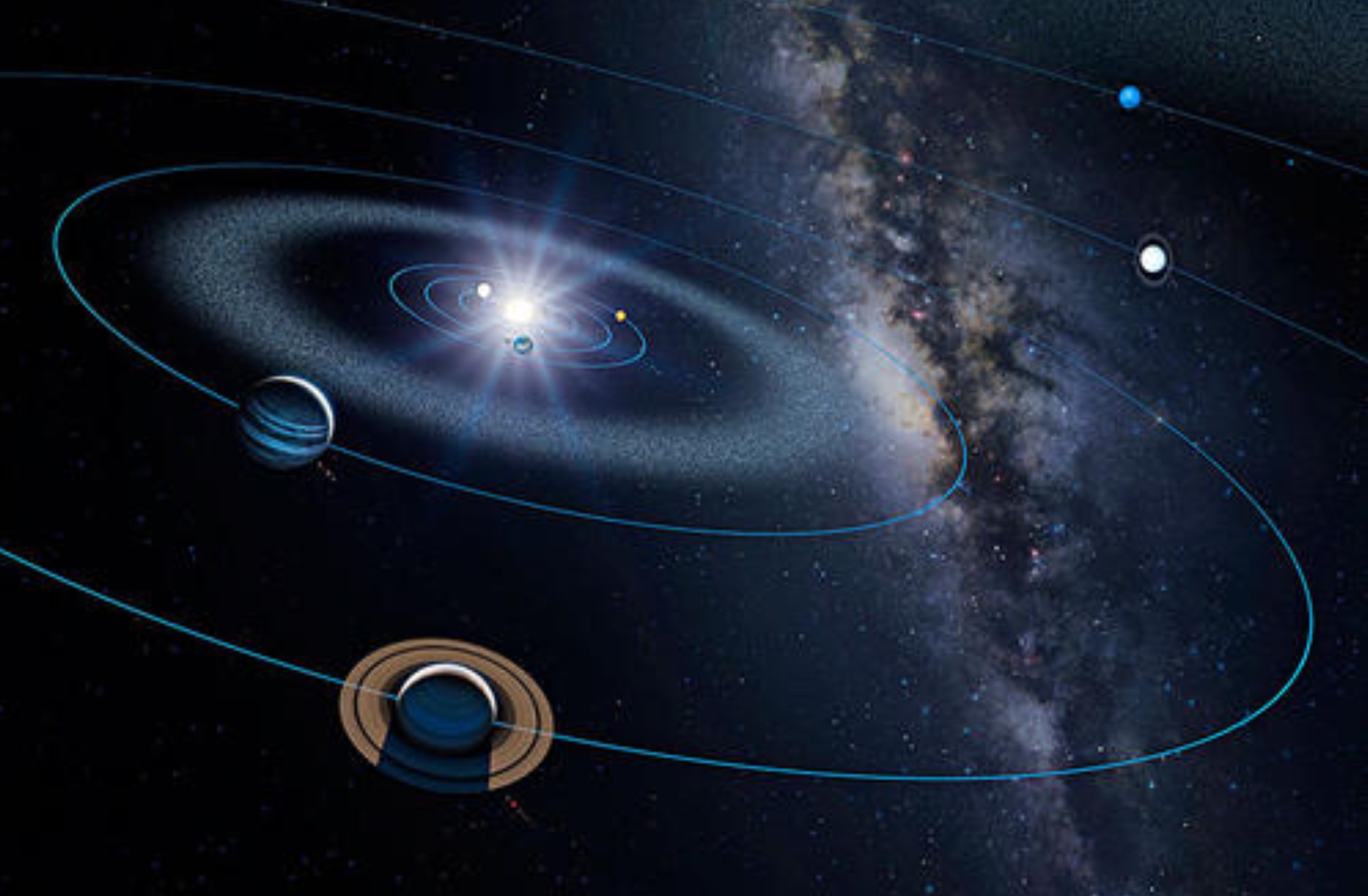 再远点,太阳就基本上是一颗星星了。1光年到了太阳系边缘,那里是太阳引力影响的范围,有几千上万亿颗彗星在那里活动。