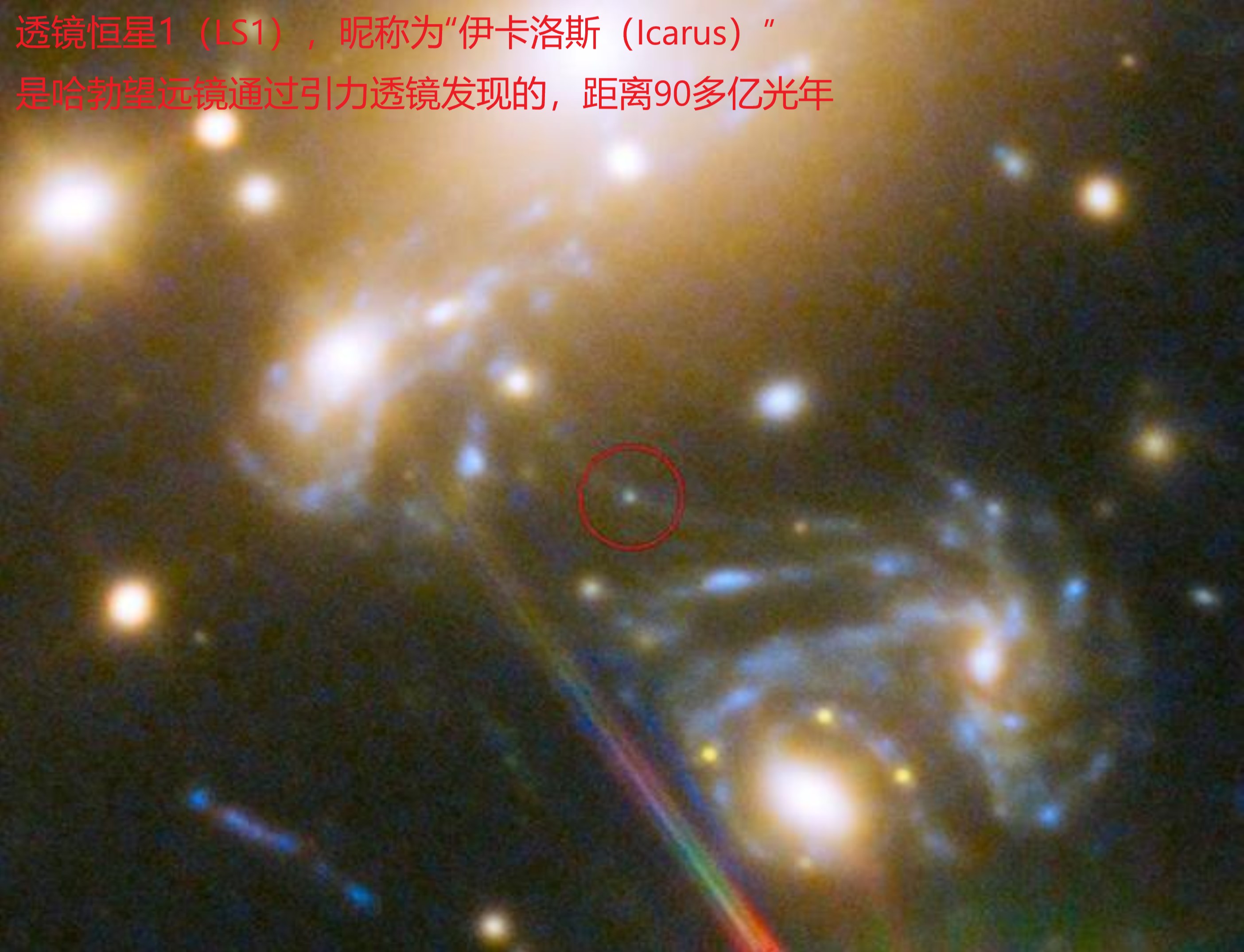 还能够通过太空中巨大天体形成的引力透镜,把更远处的微弱光点放大,比如发现了最远恒星~透镜恒星1(LS1),昵称为“伊卡洛斯(Icarus),这颗恒星距离我们90多亿光年,是迄今发现最古老最远的恒星。