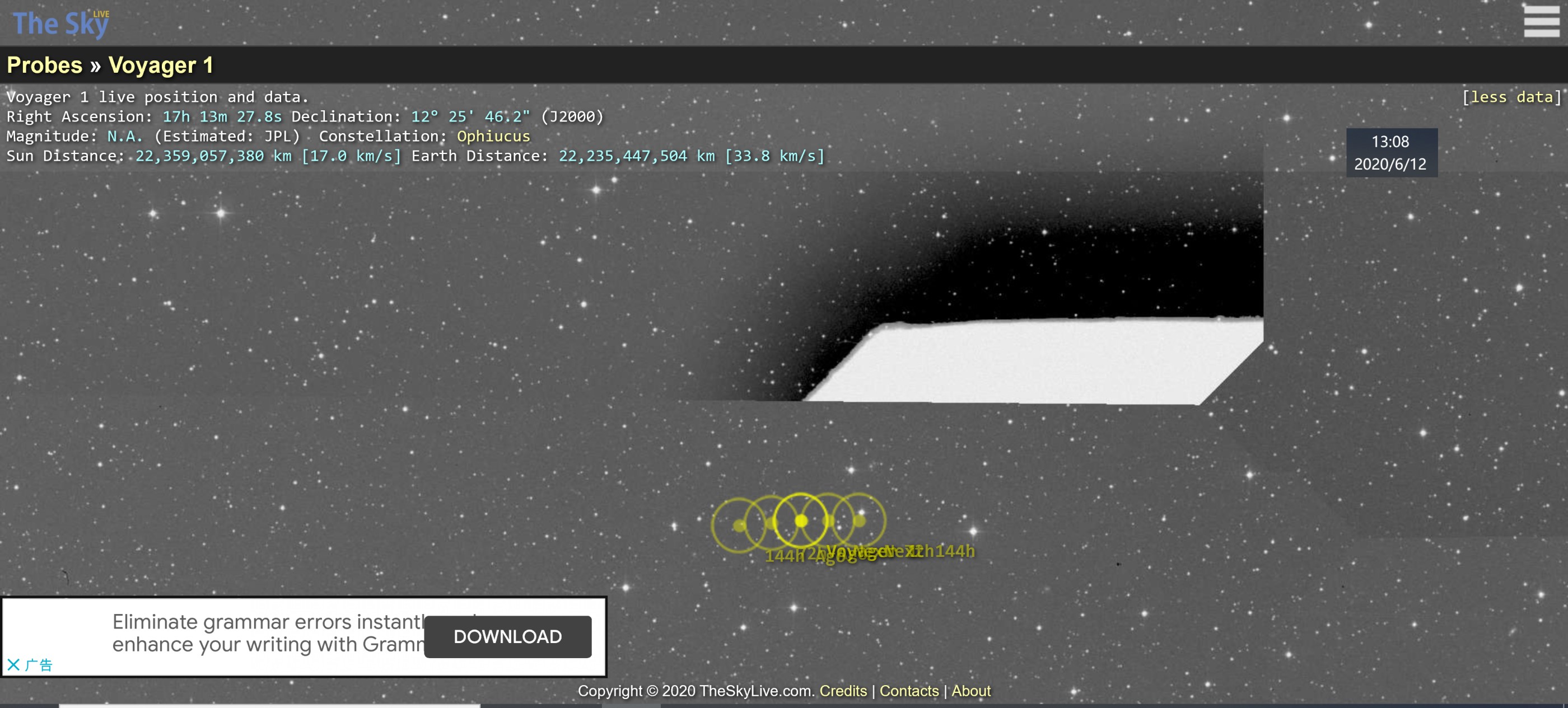 截至今天13:08分,NASA网站旅行者1号实时监控数据显示,旅行者1号以相对太阳17km/s的速度,距离太阳223.59亿km;相对地球33.8km/s的速度,距离地球222.24亿km的位置,向太阳系外飞去。(见上面截图)