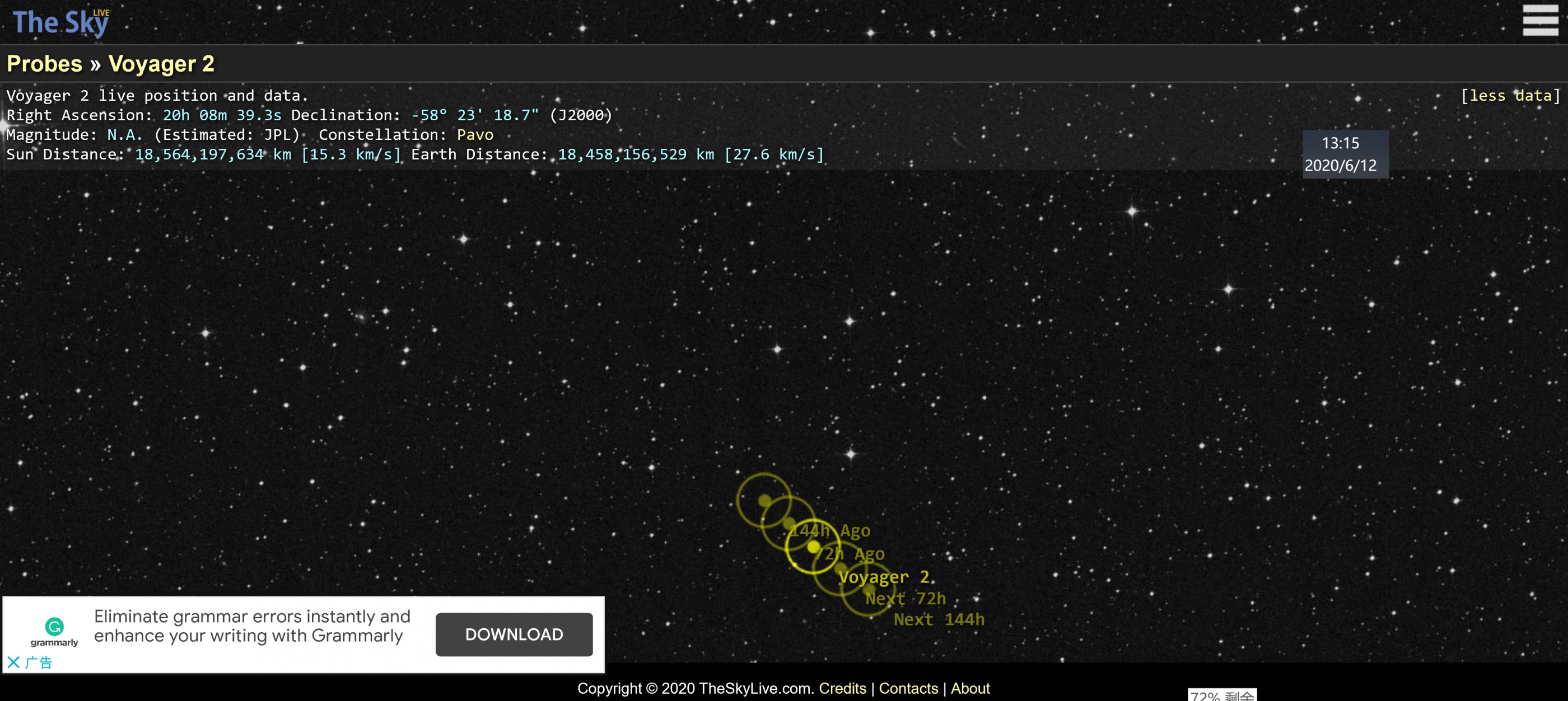 而NASA网站旅行者2号的实时监控数据显示,旅行者2号正以相对太阳15.3km/s的速度,在距离太阳185.64亿km;以相对地球27.6km/s的速度,距离地球184.58亿千米的位置,向太阳系外飞去。(见上面截图)