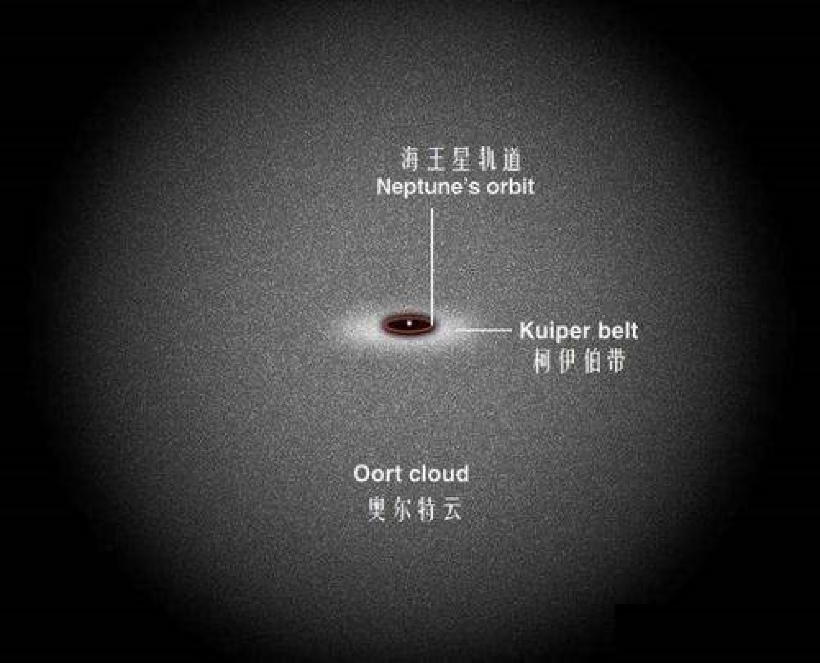 在这一个广袤的区域,是彗星的乐园。这里非常寒冷,接近绝对零度,水汽夹杂着太空尘埃凝聚成脏雪球(彗星),有时聚集增大,有时碰撞碎裂,偶尔有几颗飞向太阳,就成为我们能够看到的彗星。
