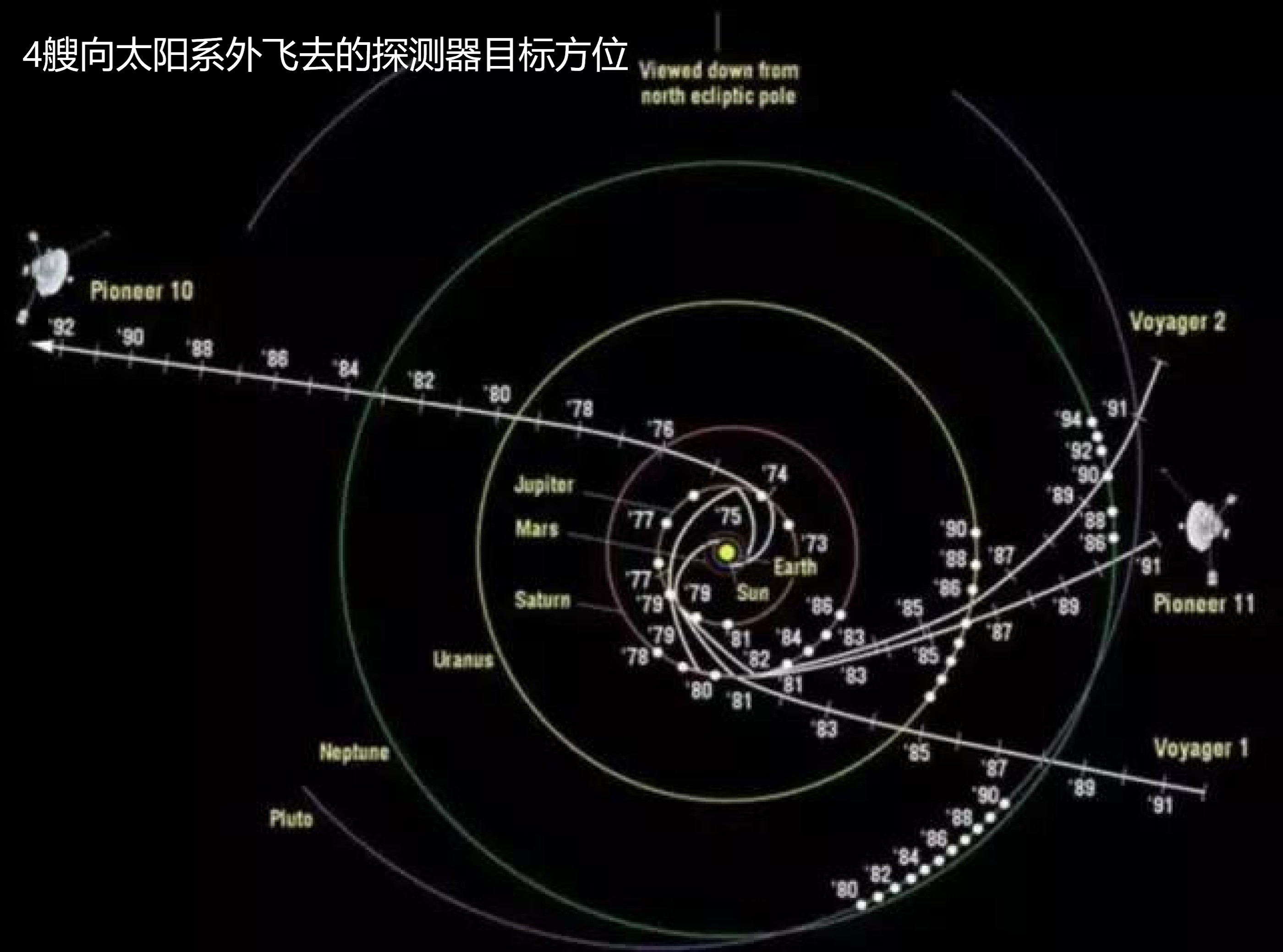 现在飞往太阳系外的人造探测器已经有4艘,它们正从不同方位飞离太阳系。