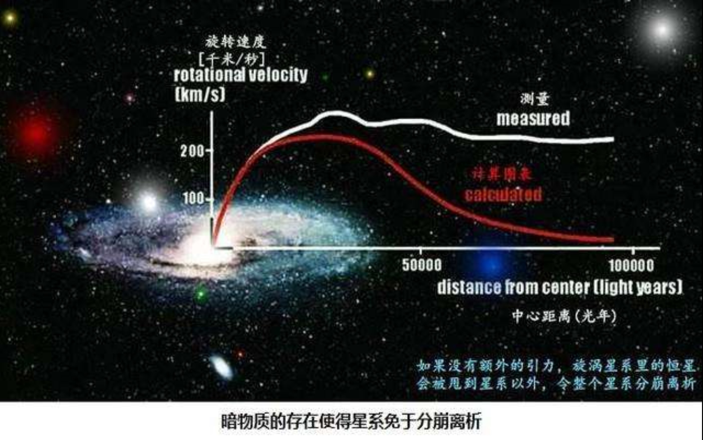 根据万有引力定律,一个星系的质量完全不具备保持这种状态的引力,经过计算形成这种引力的物质比可见物质大若干倍,于是人们把这种物质称为“暗物质”。研究发现,这种暗物质是将宇宙连接起来的主要力量。