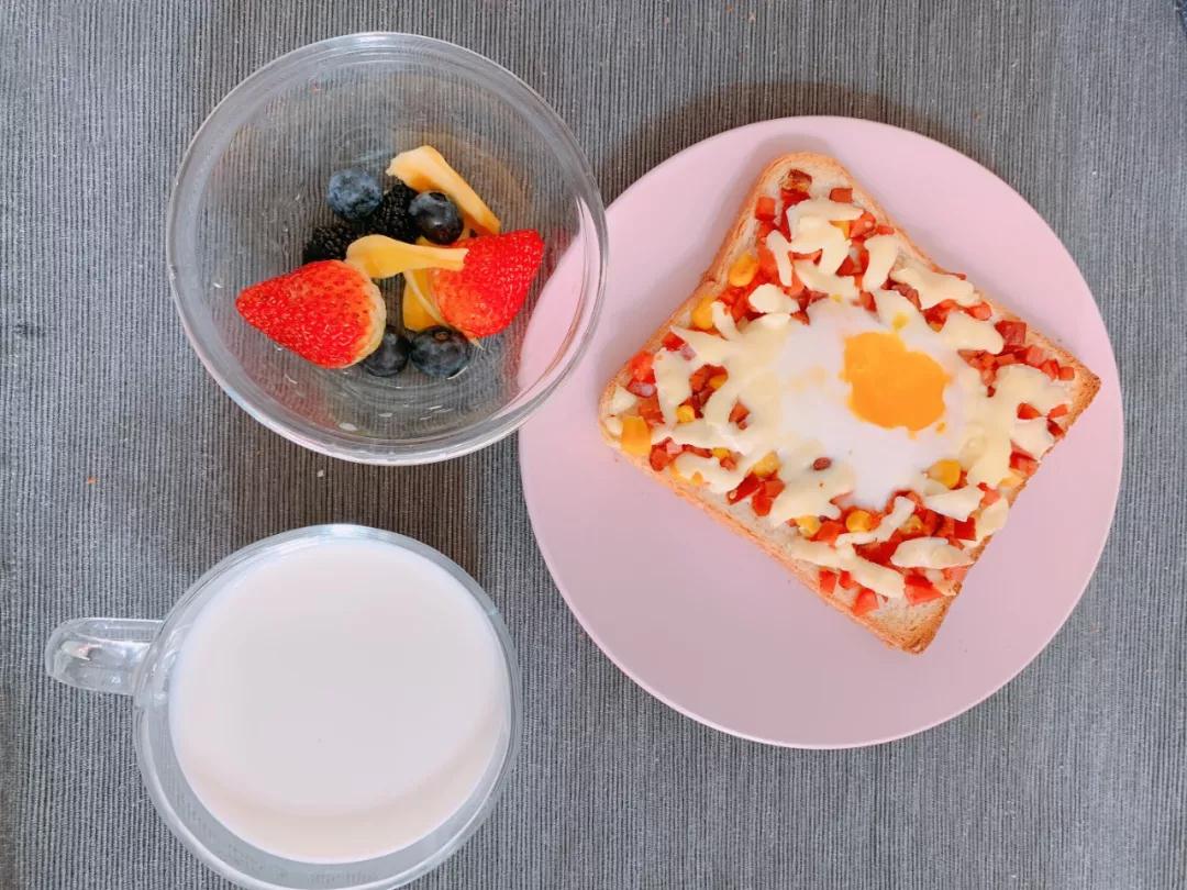 原料:全麦面包片+芝士(马苏里拉)+培根碎+胡萝卜丁+玉米丁+番茄丁+鸡蛋,小烤箱烤十分钟。草莓蓝莓(樱桃、蓝莓、草莓、苹果,都可以,换着吃最好)。另外,吃的时候也可以加点生菜。因为有奶酪了,牛奶换成豆浆也可以。
