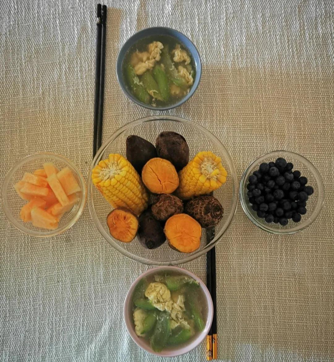 夏天到了,丝瓜做蛋汤,非常方便,也可以补充蔬菜的摄入。然后主食是玉米、红薯、紫薯、山药,都一起放蒸箱蒸的,整体时间也很快。